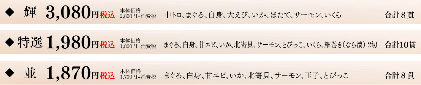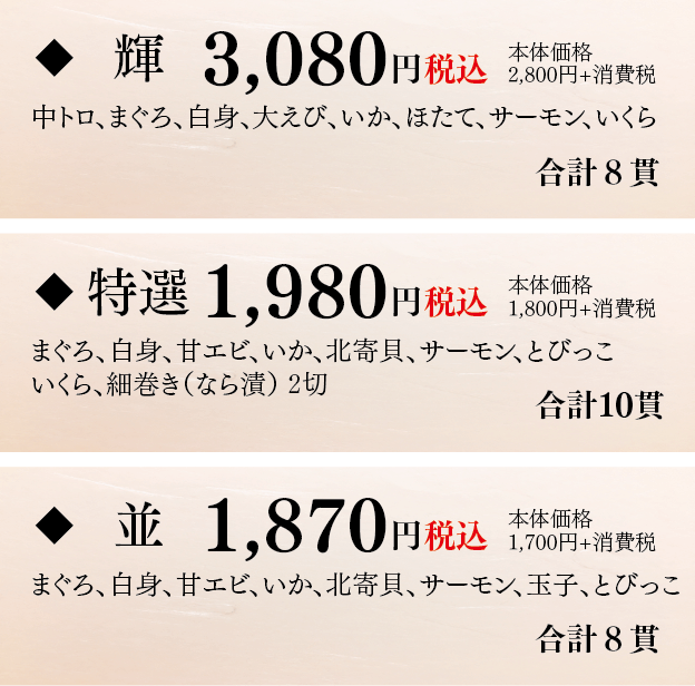 ※季節・仕入事情などにより、ネタに変更が生じる場合もございます。予めご容赦下さい。